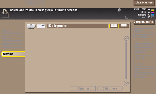 Al imprimir un documento desde el PC en el entorno de un sistema de trabajo con autenticación de usuario, los archivos transferidos con la función ID e impresión se almacenan en la carpeta de usuario de ID e impresión. Cuando un usuario que ha enviado datos de impresión inicia sesión en la máquina y abre la carpeta de usuario, puede previsualizar, imprimir o eliminar el archivo almacenado.