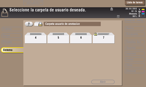 Para acceder a un archivo de esta carpeta de usuario, seleccione la carpeta de usuario deseada y, a continuación, toque [Abrir].