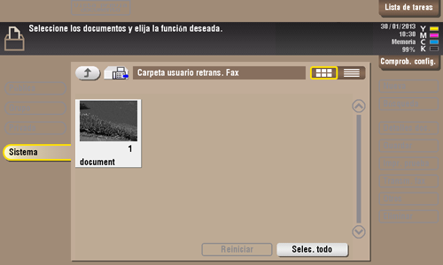 Cuando el destinatario está ocupado y no se puede establecer la comunicación, los documentos de fax que no pueden entregarse se almacenan en la carpeta de usuario de retransmisión de fax. Una vez que ha abierto la carpeta de usuario, puede seleccionar un documento de fax almacenado en la carpeta de usuario y previsualizarlo, imprimirlo, enviarlo o eliminarlo.