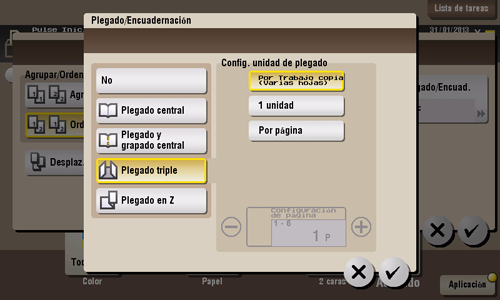 Se obtiene una hoja impresa plegada en tres. Seleccione también la Unidad mediante la cual se pliega el papel en [Por Trabajo copia (Varias hojas)], [1 unidad] y [Por página]. Al configurar [Por página], especifique el número de páginas que deben plegarse al mismo tiempo.