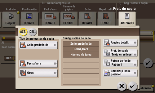 [Tipo de protección de copia] | Seleccione un sello utilizado. También pueden imprimirse la fecha y hora.