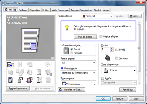 Lorsque vous utilisez une combinaison de réglages d'impression souvent utilisés, vous pouvez appliquer facilement la totalité de ces réglages juste en sélectionnant la combinaison la liste des Réglages favoris, même si la combinaison est complexe et contient plusieurs onglets.
