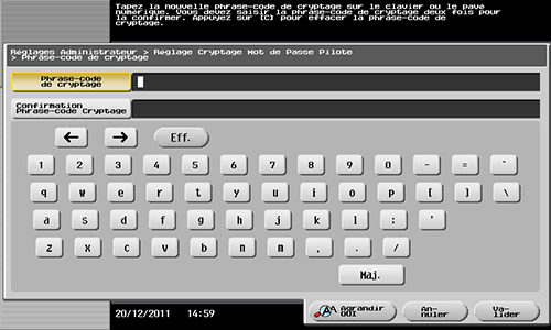Tapez sur [Phrase-code de cryptage] et entrez la nouvelle phrase-code de cryptage (20 caractères alphanumériques max., symboles compris).