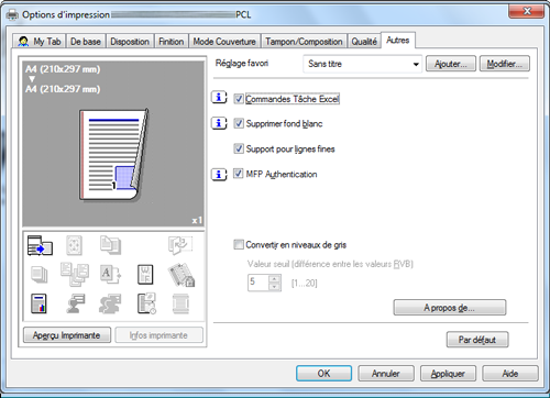 [Support pour lignes fines] (PCL seulement) | Cochez cette case pour obtenir une impression à format réduit. Cette fonction évite la disparition des traits fins. Cette fonction est utile pour les traits fins comme les bordures d'une feuille Excel, mais pas pour les contours fins des illustrations. |