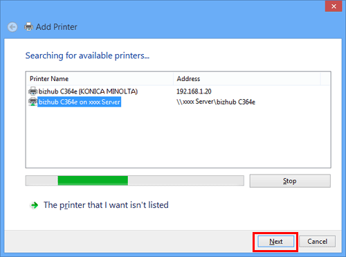Dans la fenêtre affichant l'imprimante détectée, cliquez sur [L'imprimante voulue n'est pas dans la liste].