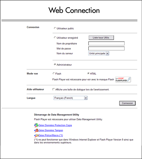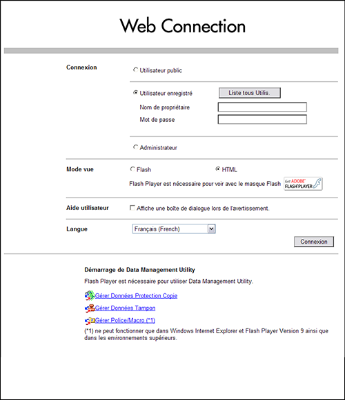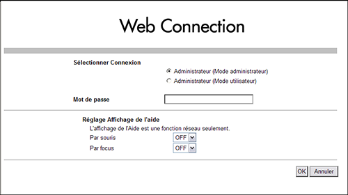 Deux modes de connexion de Web Connection sont proposés : le "Mode administrateur" qui permet de configurer les réglages de cette machine et le "Mode utilisateur" qui permet d'utiliser les fonctions de cette machine.
