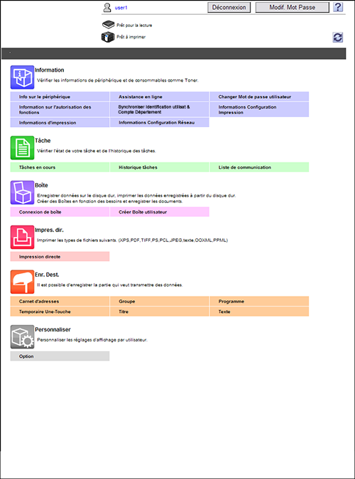 L'affichage du menu principal vous permet d'afficher les menus disponibles dans Web Connection sur un seul écran.