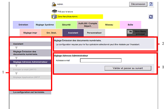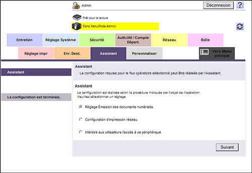 Pour configurer les réglages à l'aide de l'Assistant, connectez-vous en mode Administrateur, puis sélectionnez [Assistant].