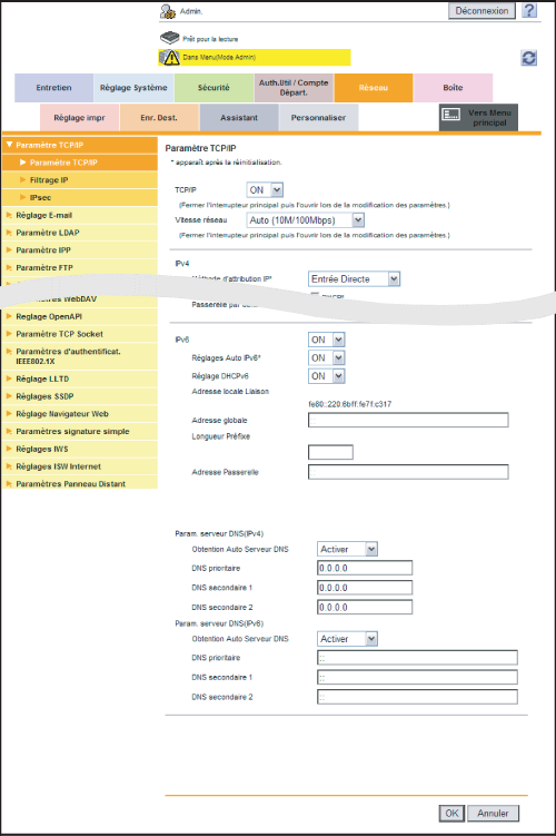 En mode administrateur, sélectionnez [Réseau] - [Paramètre TCP/IP] - [Paramètre TCP/IP], puis configurez les paramètres suivants.