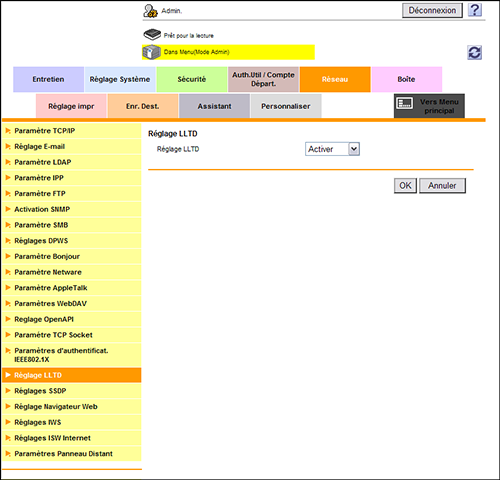 En mode Administrateur, sélectionnez [Réseau] - [Réglage LLTD] et définissez [Réglage LLTD] sur [Activer] (par défaut : [Activer]).