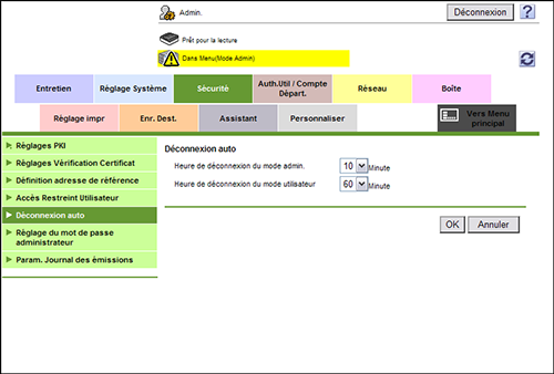 Le délai jusqu'à la déconnexion automatique peut être spécifié pour le mode Administrateur et le mode Utilisateur, respectivement. Par exemple, si vous définissez un délai court pour le mode Administrateur pendant lequel les réglages peuvent être modifiés, vous pouvez réduire la probabilité d'utilisation par un tiers. De l'autre côté, si vous définissez un délai long pour le mode Utilisateur, vous pouvez continuer à profiter de la commodité d'utilisation du navigateur Web, comme l'enregistrement de l'adresse qui est difficile à effectuer sur l'Écran tactile.