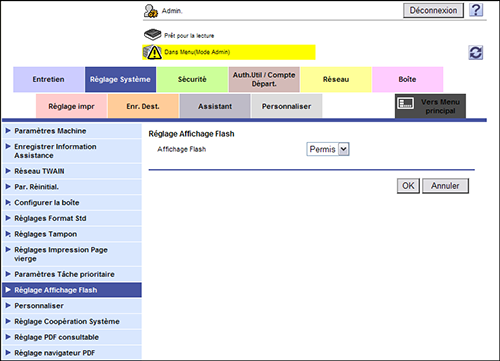 En mode Administrateur, sélectionnez [Réglage Système] - [Réglage Affichage Flash] et définissez [Affichage Flash] sur [Interdire] (par défaut : [Permis]).