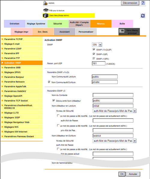 En mode Administrateur, sélectionnez [Réseau] - [Activation SNMP], puis configurez les réglages suivants.