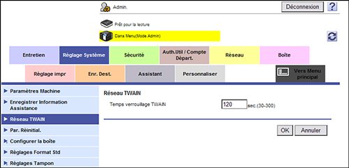 En mode Administrateur, sélectionnez [Réglage Système] - [Réseau TWAIN] et modifiez la valeur [Temps verrouillage TWAIN] (par défaut : [120] s).