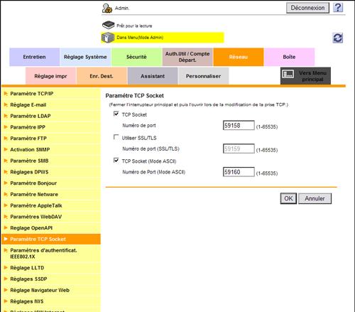 En mode administrateur, sélectionnez [Réseau] - [Paramètre TCP Socket], puis configurez les réglages suivants.