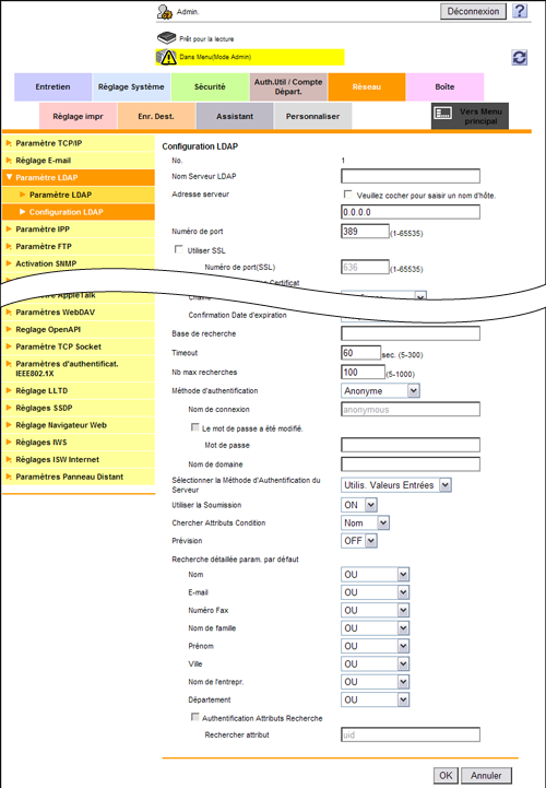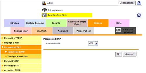[Activation LDAP] | Sélectionnez [ON] pour utiliser la fonction Recherche LDAP. [OFF] est spécifié par défaut. |