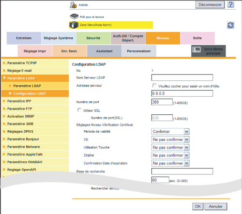 En mode Administrateur, sélectionnez [Réseau] - [Paramètre LDAP] - [Paramètre LDAP], puis configurez les paramètres suivants.