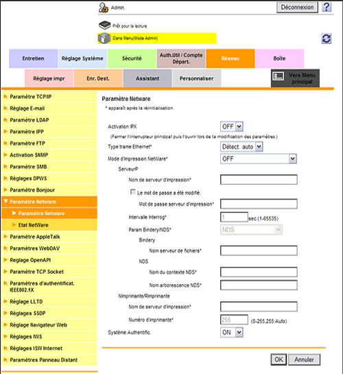 En mode administrateur, sélectionnez [Réseau] - [Paramètre Netware] - [Paramètre Netware], puis configurez les réglages suivants.