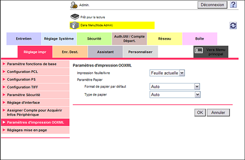 En mode Administrateur, sélectionnez [Réglage impr] - [Paramètres d'impression OOXML] et configurez les réglages suivants.