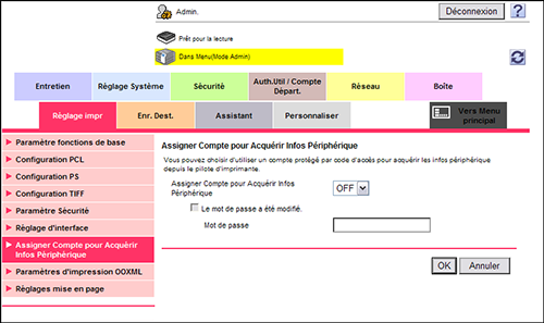 En mode Administrateur, sélectionnez [Réglage impr] - [Assigner Compte pour Acquérir Infos Périphérique], puis configurez les réglages suivants.