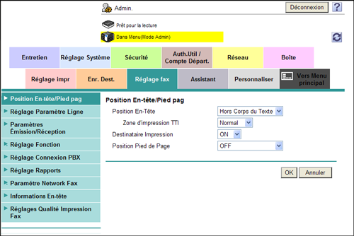En mode Administrateur, sélectionnez [Réglage fax] - [Position En-tête/Pied pag], puis configurez les paramètres suivants.