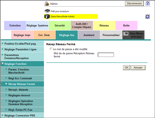 En mode Administrateur, sélectionnez [Réglage fax] - [Réglage Fonction] - [Récep Réseau Fermé] et cochez la case [Le mot de passe a été modifié]. (par défaut : [OFF] (non sélectionné). Saisissez ensuite le mot de passe afin d'interdire les homologues de la communication (quatre chiffres max.).