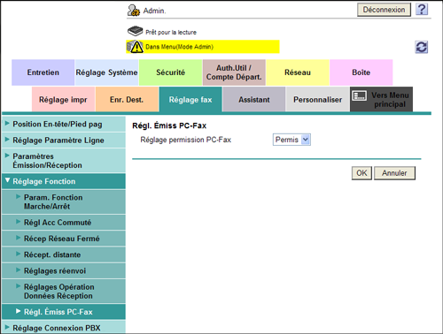 Pour interdire l'émission Fax PC, sélectionnez, en mode Administrateur, [Réglage fax] - [Réglage Fonction] - [Régl. Émiss PC-Fax] - [Interdire] (par défaut : [Permis]).
