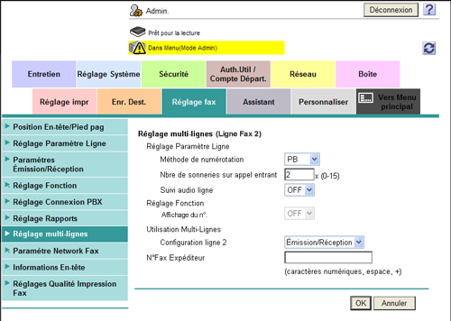 Cet exemple décrit un écran de réglage de [Ligne Fax 2].