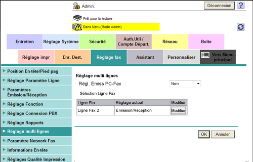 En mode Administrateur, sélectionnez [Réglage fax] - [Réglages multi-lignes], puis configurez les réglages suivants.