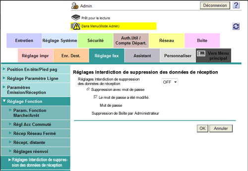 En mode administrateur, sélectionnez [Réglage Fax] - [Réglage Fonction] - [Réglages Interdiction Suppression Données Réception], puis configurez les réglages suivants.