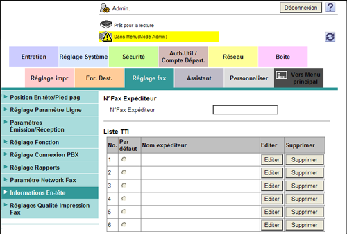 En mode Administrateur, sélectionnez [Réglage fax] - [Informations En-tête], puis configurez les réglages suivants.