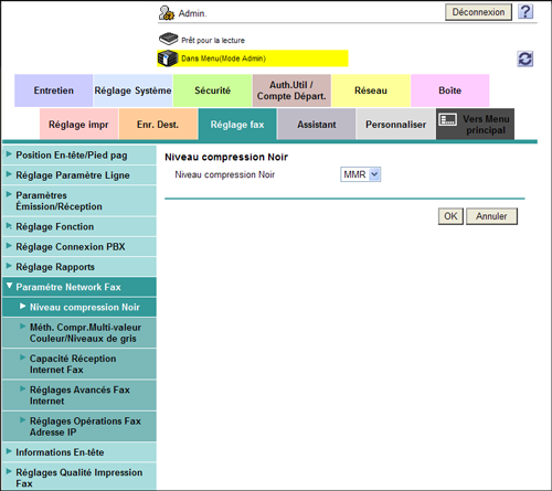 En mode Administrateur, sélectionnez [Réglage fax] - [Paramètre Network Fax] - [Niveau compression Noir], puis configurez les paramètres suivants.