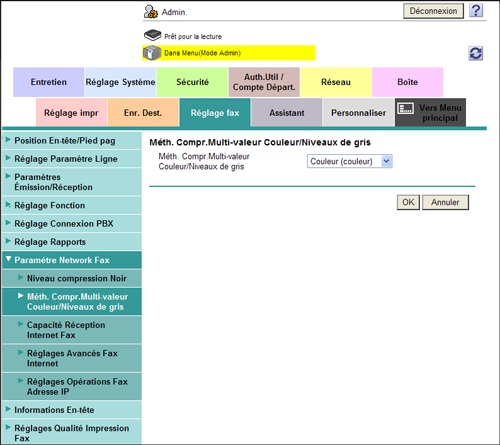 En mode Administrateur, sélectionnez [Réglage fax] - [Paramètre Network Fax] - [Méth. Compr.Multi-valeur Couleur/Niveaux de gris], puis configurez les paramètres suivants.