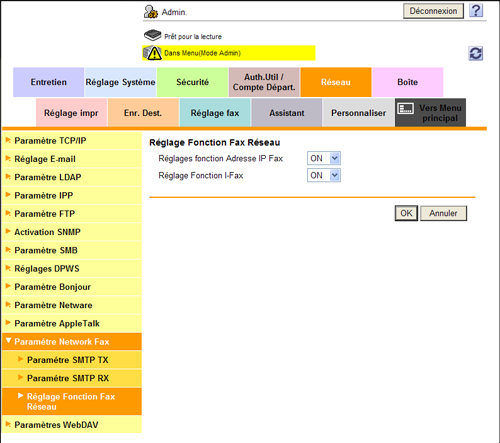 En mode Administrateur, sélectionnez [Réseau] - [Paramètre Network Fax] - [Réglage Fonction Fax Réseau], puis définissez [Réglages fonction Adresse IP Fax] sur [ON] (par défaut : [OFF]).