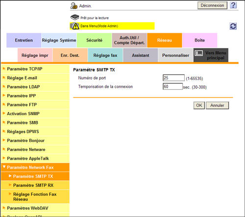 En mode Administrateur, sélectionnez [Réseau] - [Paramètre Network Fax] - [Paramètre SMTP TX], puis configurez les réglages suivants.