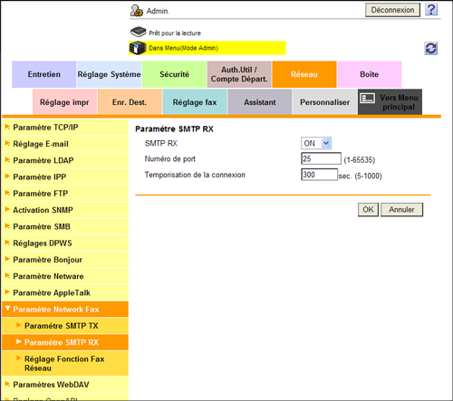 En mode Administrateur, sélectionnez [Réseau] - [Paramètre Network Fax] - [Paramètre SMTP RX], puis configurez les paramètres suivants.
