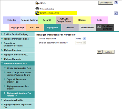 [Envoi de documents en couleurs] | Indiquez si vous souhaitez ou non accepter l'envoi de fax couleur lors de la sélection de [Mode d'exploitation] pour [Mode 2]. Pour envoyer un fax à une machine qui ne prend pas en charge la réception en couleur sur la base du standard SMTP direct, sélectionnez [Interdit]. [Autorisé] est spécifié par défaut. |