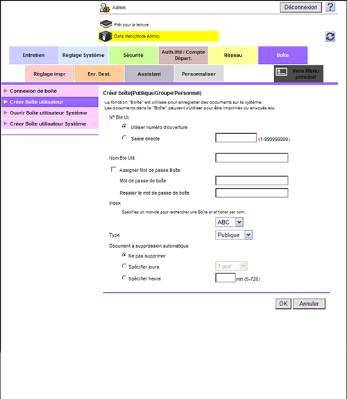 En mode Administrateur, sélectionnez [Boîte] - [Créer Boîte utilisateur], puis configurez les réglages suivants.