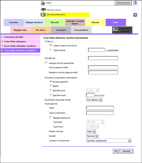 En mode Administrateur, sélectionnez [Boîte] - [Créer Boîte utilisateur Système] - [Boîte Annotation], puis configurez les réglages suivants.