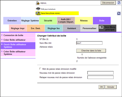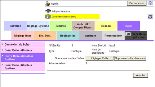 En mode Administrateur, sélectionnez [Boîte] - [Ouvrir Boîte utilisateur Système] - [Boîte Utilisateur Relais] pour sélectionner une boîte utilisateur.