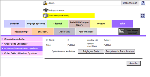 Un clic sur [Supprimer boîte utilisateur] supprime la boîte utilisateur que vous avez sélectionnée.