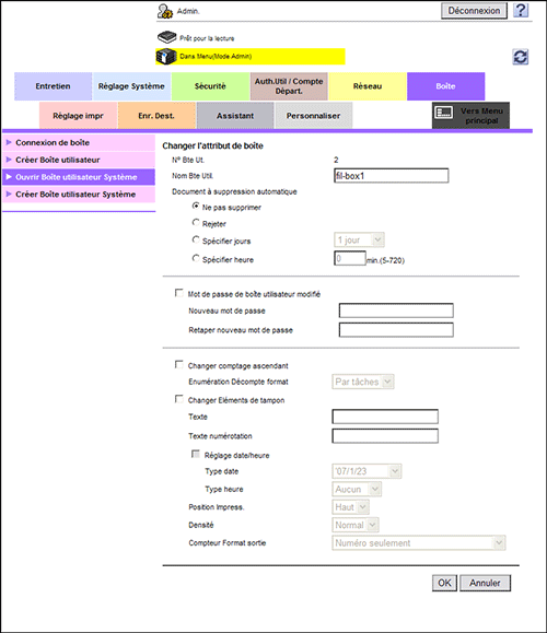 Utilisez [Changer l'attribut de boîte] pour modifier les réglages de la boîte utilisateur.