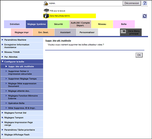 En mode Administrateur, sélectionnez [Réglage Système] - [Configurer la boîte] - [Suppr. bte util. inutilisée], puis sélectionnez [OK].