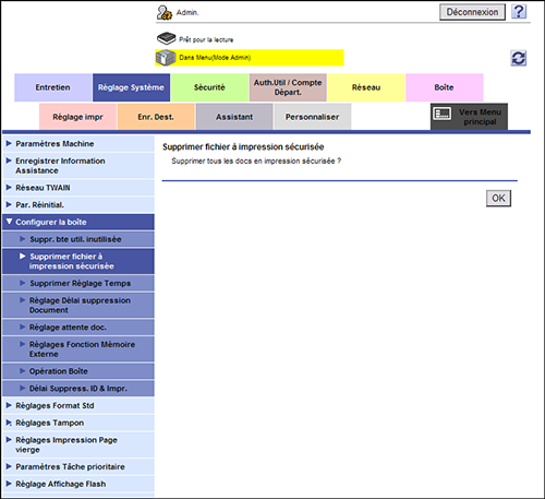 En mode Administrateur, sélectionnez [Réglage Système] - [Configurer la boîte] - [Supprimer fichier à impression sécurisée], puis cliquez sur [OK].