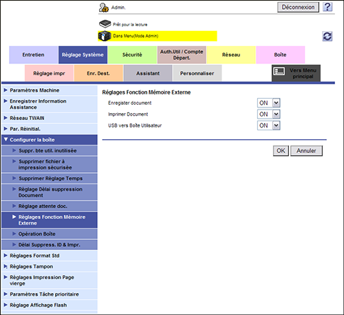 En mode Administrateur, sélectionnez [Réglage Système] - [Configurer la boîte] - [Réglages Fonction Mémoire Externe], puis configurez les réglages suivants.