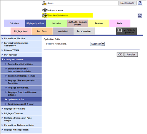 En mode Administrateur, sélectionnez [Réglage Système] - [Configurer la boîte] - [Opération Boîte], puis configurez les réglages suivants.
