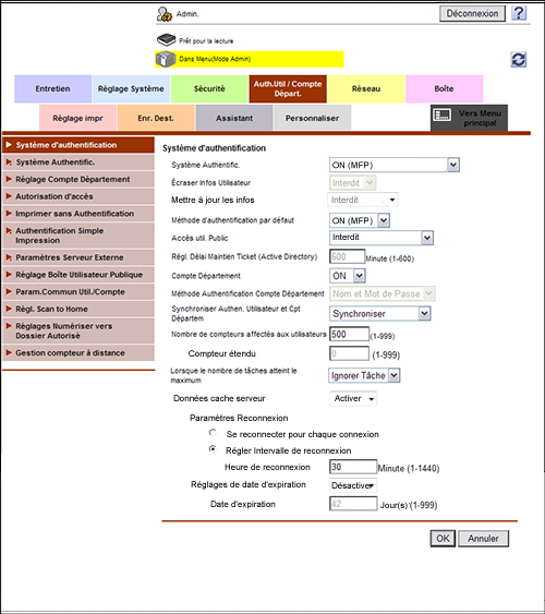 En cas d'utilisation de la fonction Authentification MFP, suivez la procédure ci-dessous pour configurer les réglages.