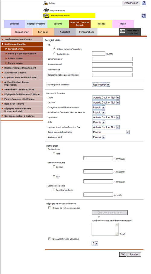 En mode Administrateur, sélectionnez [Auth.Util/Compte Départ.] - [Système Authentific.] - [Enregist. utilis.] - [Nouvel enregistrement], puis enregistrez un utilisateur.