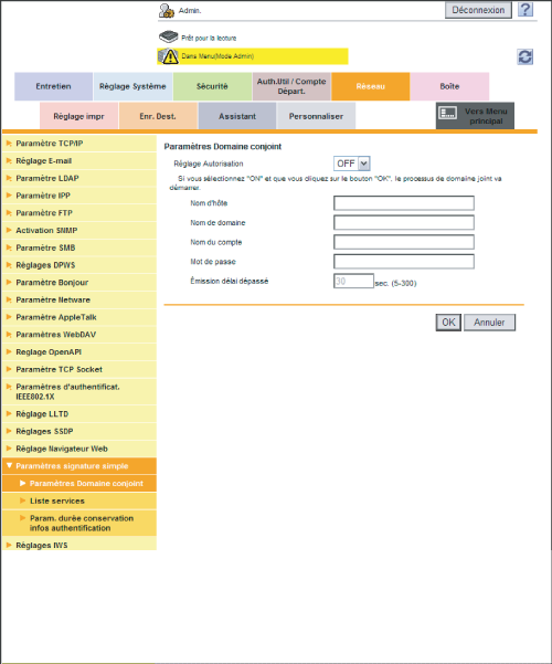 En mode Administrateur, sélectionnez [Réseau] - [Paramètres signature simple] - [Paramètres Domaine conjoint], puis enregistrez le domaine que rejoint cette machine.