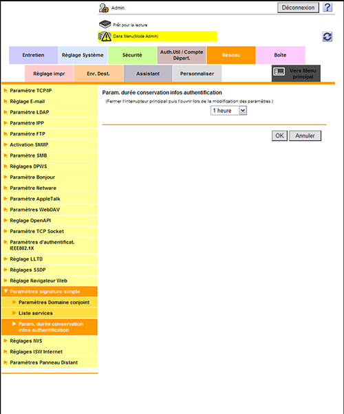 En mode Administrateur, sélectionnez [Réseau] - [Paramètres signature simple] - [Param. durée conservation infos authentification], puis modifiez le délai de conservation des informations d'authentification sur cette machine.